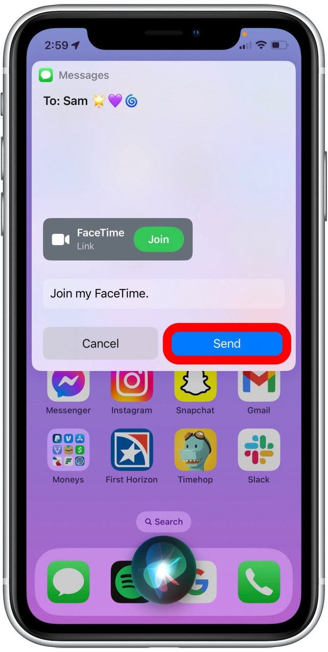 - 您还可以让 Siri 通过链接向 Android 用户发起 FaceTime 通话。轻敲发送邀请他们参加 FaceTime 通话。