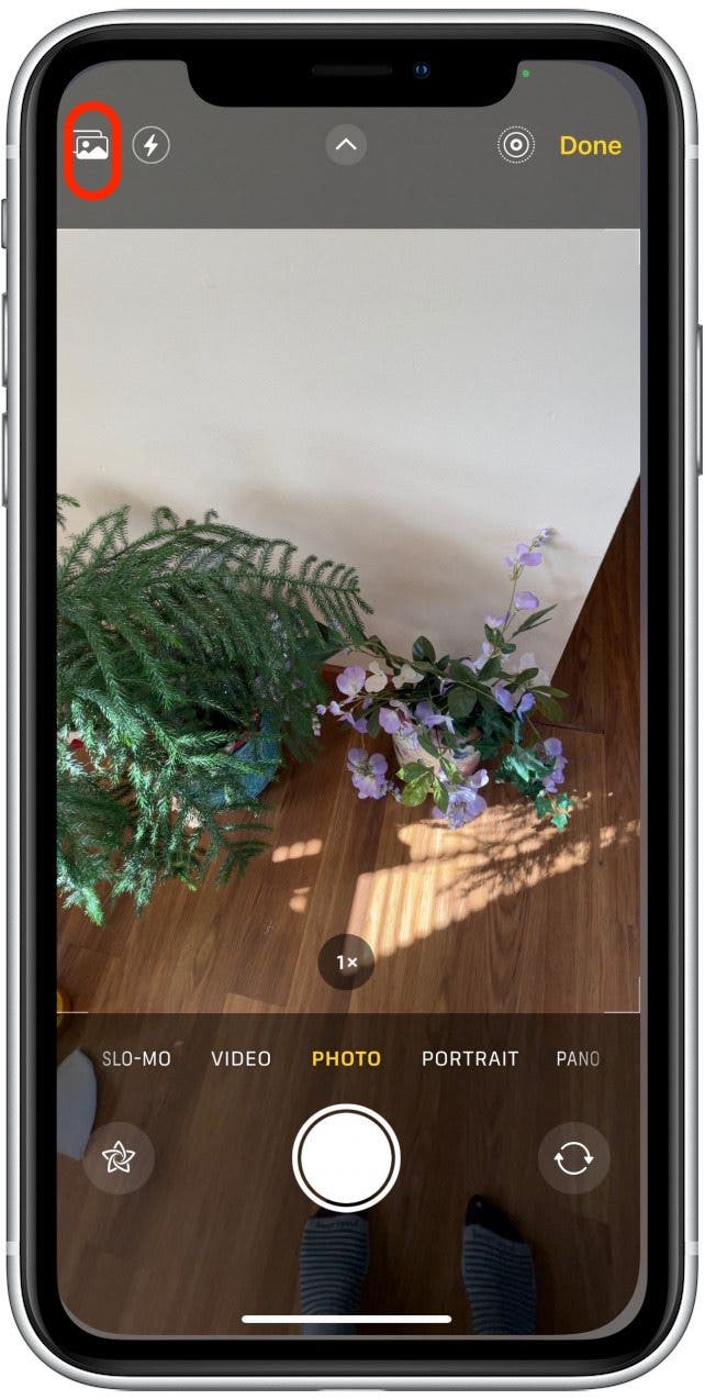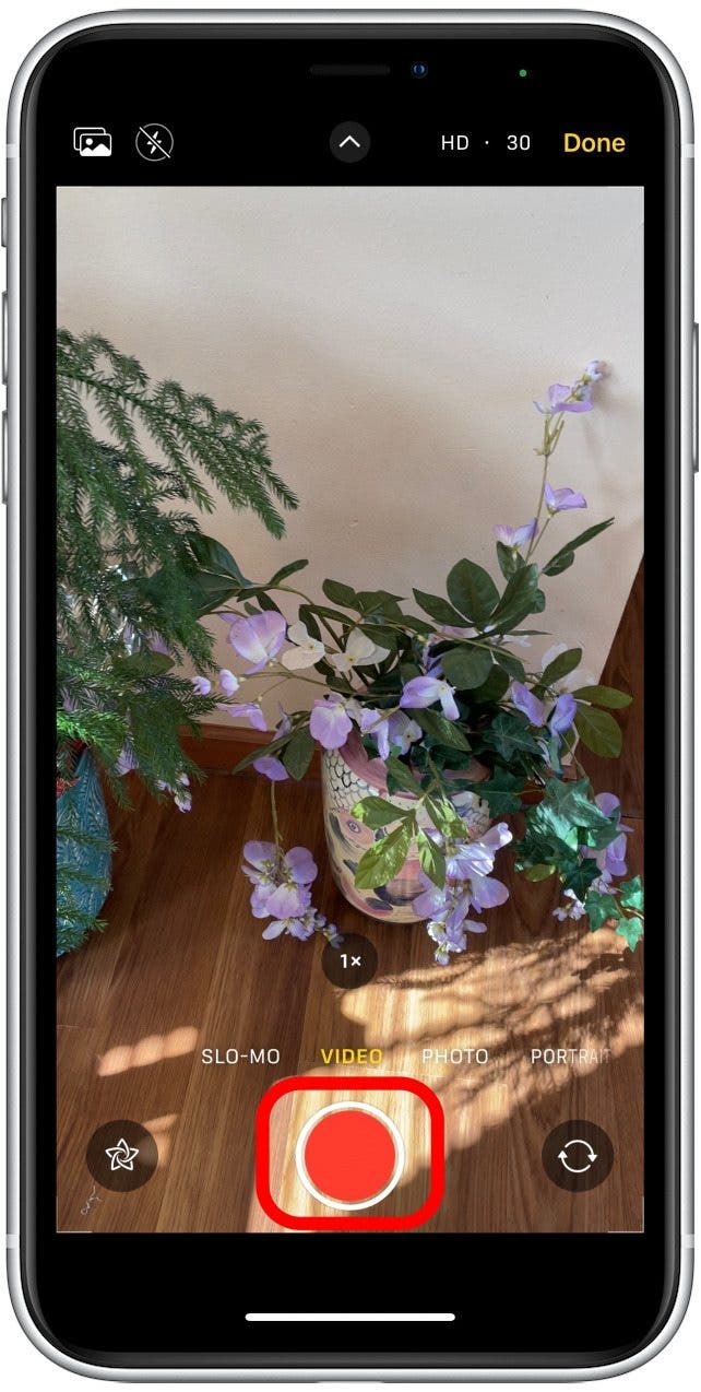 - 在快门按钮上方,向右滑动以突出显示视频录音按钮将变为红色。