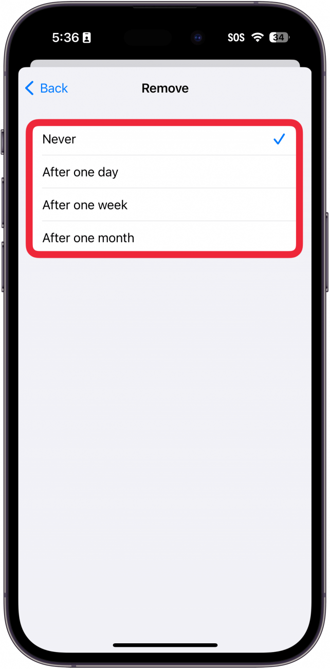 - 在这里,您可以通过选择“从不”、“一天后”、“一周后”和“一个月后”来更改已删除邮件的完全删除时间。