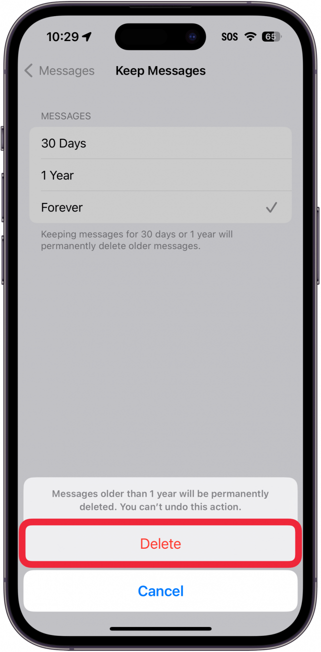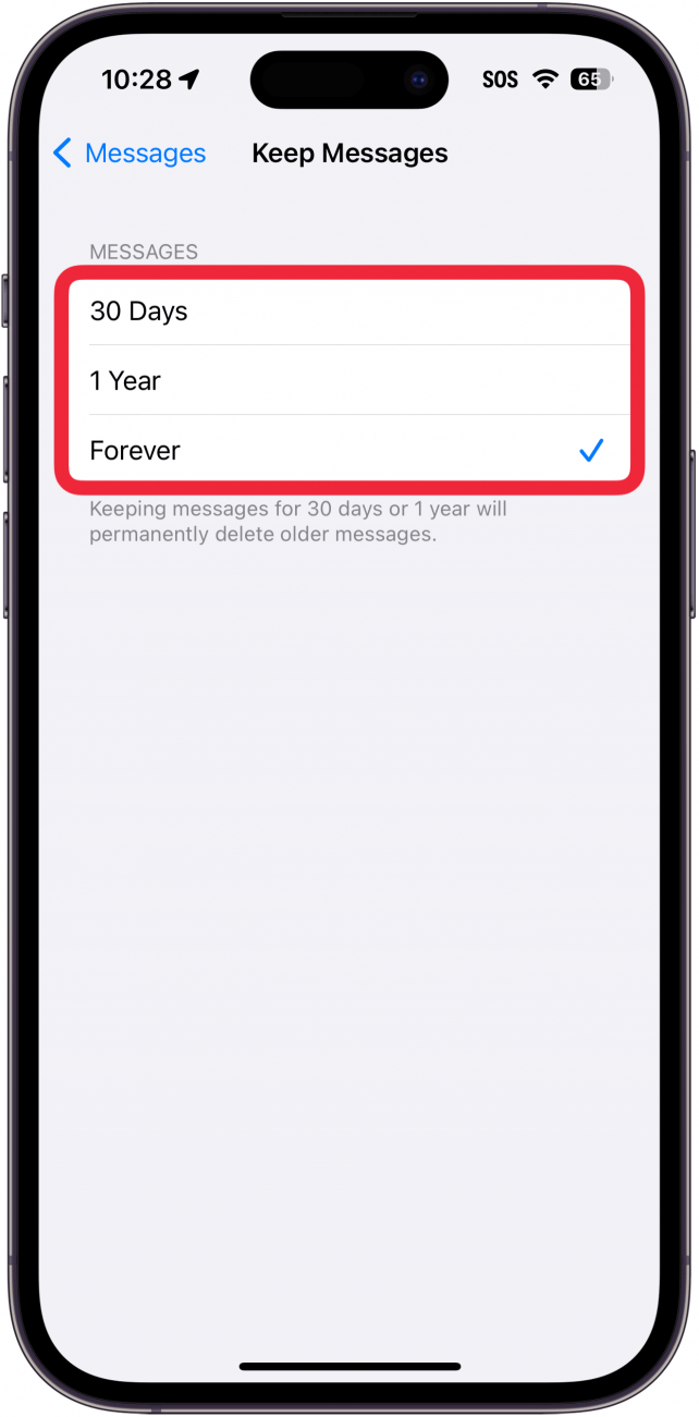 现在,您的消息将在 30 天后自动删除,或者如果您选择该选项,则在 1 年后自动删除。如果您想了解如何关闭自动删除旧对话的功能,可以按照上述相同的步骤进行操作,并在步骤 3 中选择“永久”。您可以自动删除短信,帮助您节省 iPhone 的存储空间。接下来,了解一下。