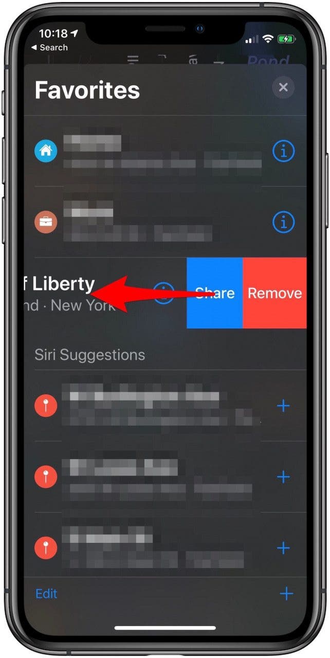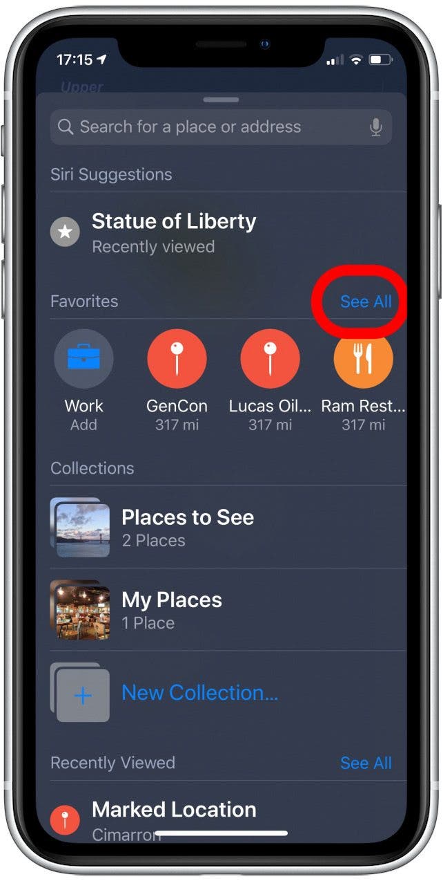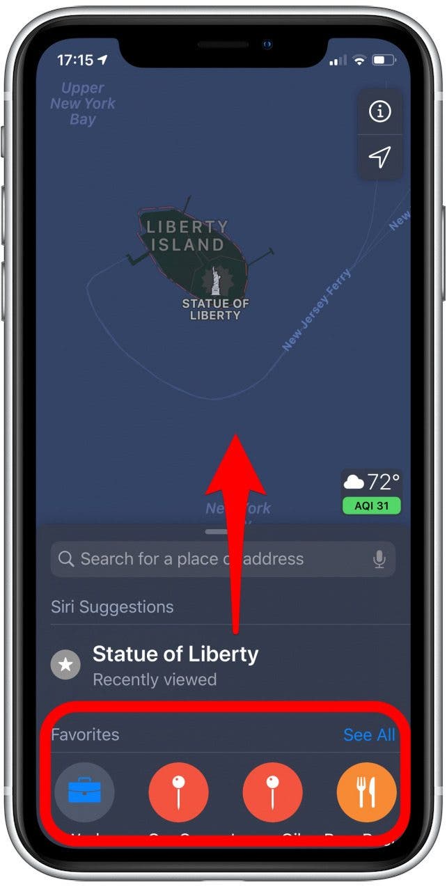 要将来访问您的收藏夹,请打开地图,然后在搜索卡的“收藏夹”部分中向左或向右滑动。