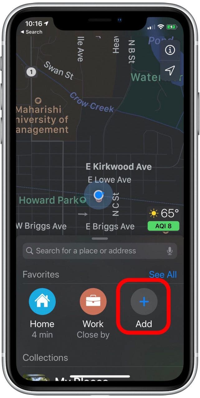 请注意,从 iOS 13 开始,Apple 地图还具有收藏,它允许您将位置保存在相关列表中,并非常适合创建愿望清单或计划您的下一个假期。只需点按一个位置,然后点按添加位于其位置卡的中心,然后选择一个集合或创建一个新集合。