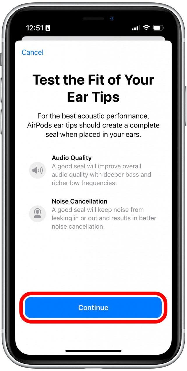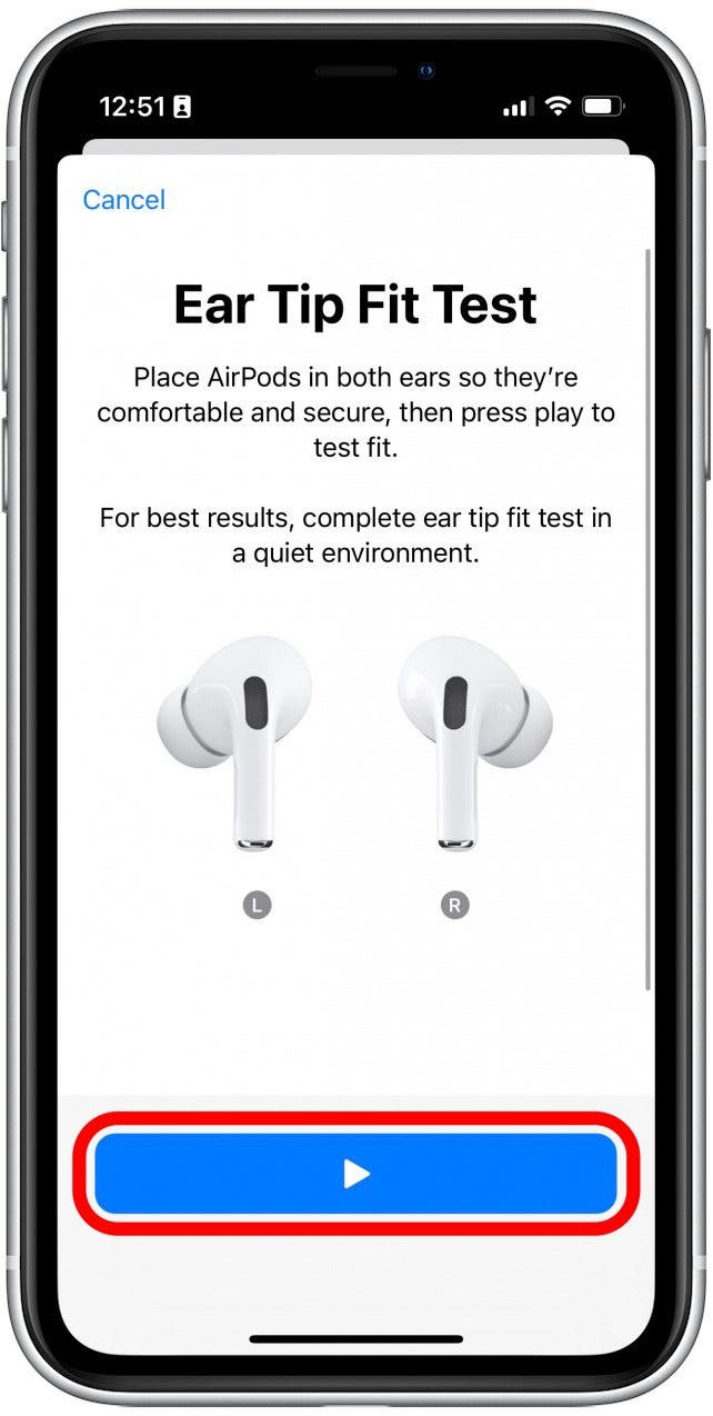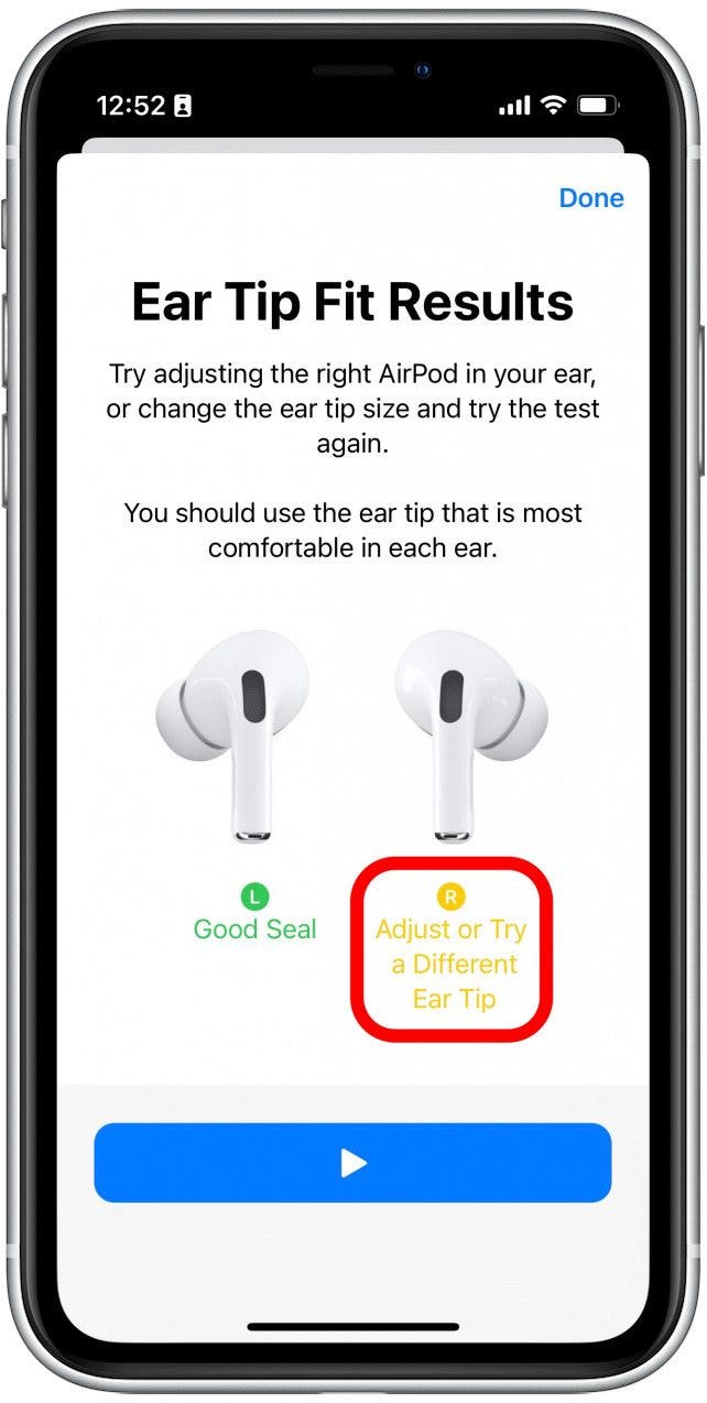 - 将 AirPods 插入耳朵后,点击播放图标播放测试声音,这将帮助您的 iPhone 确定适合您的耳塞尺寸。