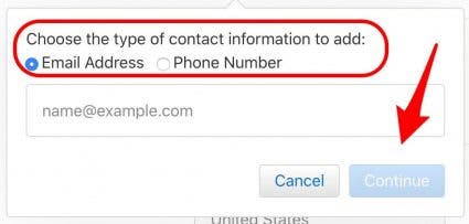 - 选择电子邮件地址或电话号码,输入您的信息,然后点击继续。