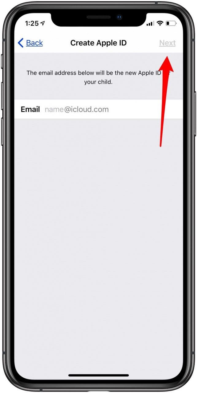 - 输入您孩子的名字和姓氏,然后点击下一个,然后输入您为他们选择的 Apple ID 并轻点下一个再次,然后点击创造。