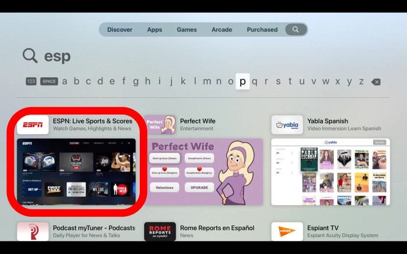 - 从这里,您将能够使用 Apple TV 遥控器上的触控板左右滚动,点按字母拼出您要查找的应用程序。您还可以选择或者按 Siri 遥控器上的麦克风图标并进行语音搜索。如果您遇到问题。