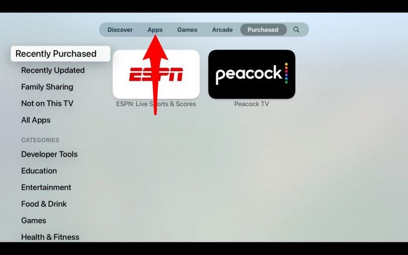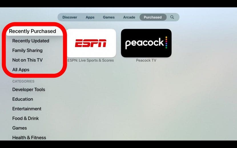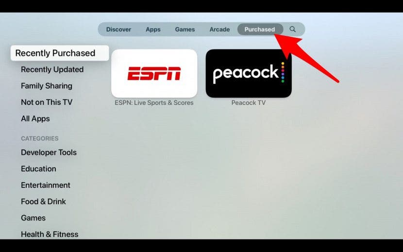 打开 App Store 后,您将有几个不同的选项来查找您想要下载的应用程序。我建议您首先检查您最近购买的内容,以查找是否有任何丢失的应用程序,例如,您的 Hulu 应用程序是否从 Apple TV 中消失了。以下是查看您现有的购买和下载的方法: