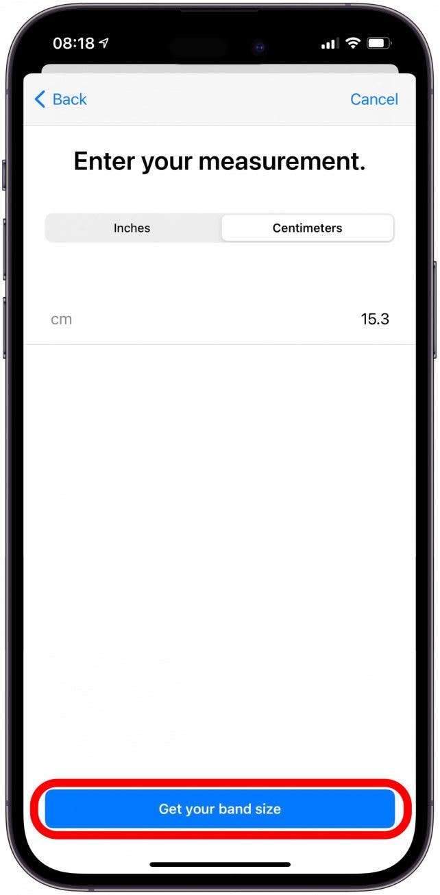 - 输入您的测量值(以英寸或厘米为单位)。轻敲获取您的表带尺寸。