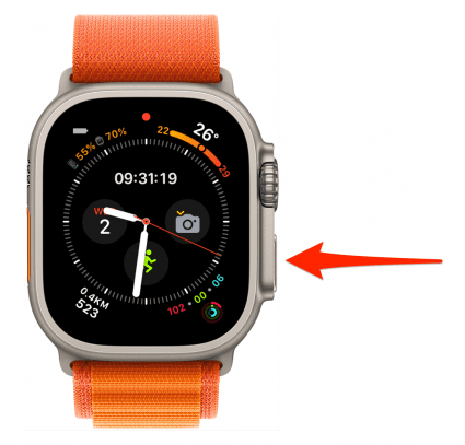 - 唤醒您的 Apple Watch,然后按侧边按钮。在 watchOS 9 及更早版本上,您必须从表盘底部向上滑动。