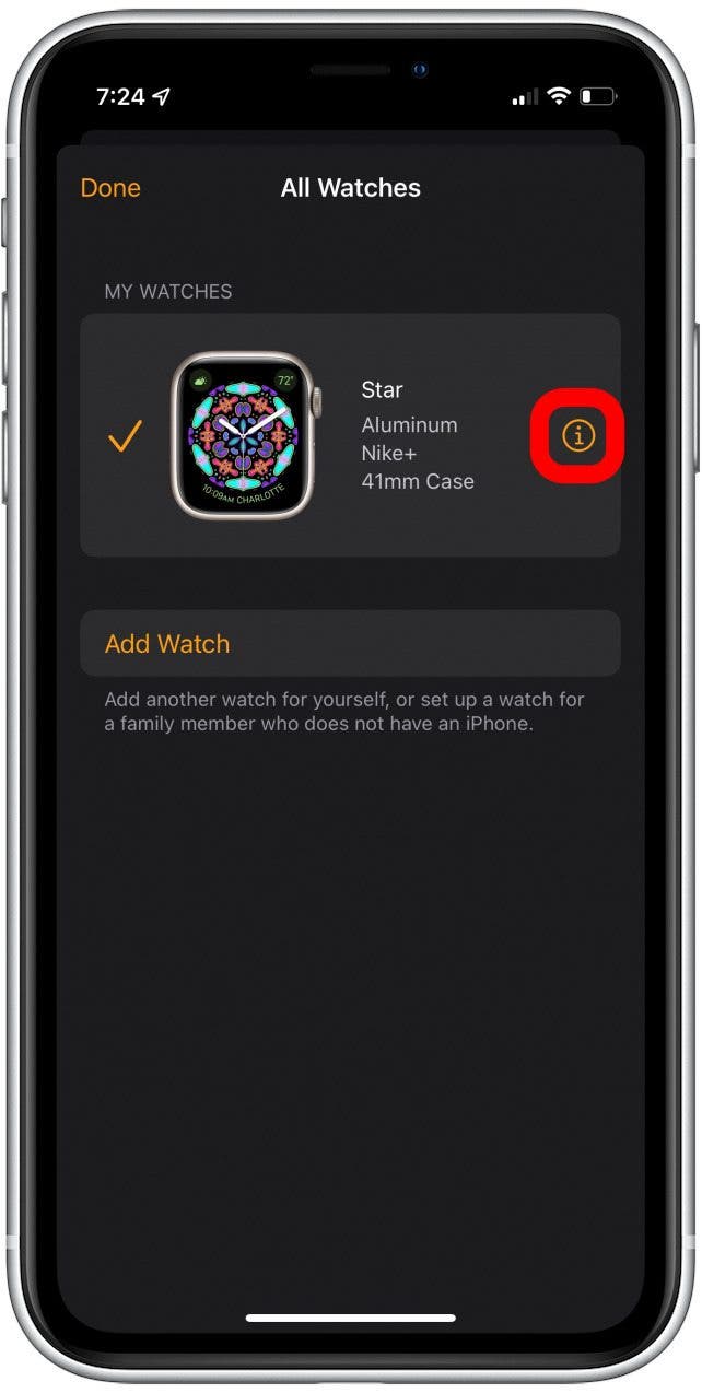 - 点击黄色信息按钮在您要取消配对的手表旁边。