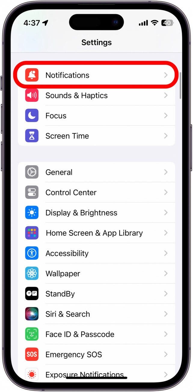 - 在您的 iPhone 上,打开设置应用程序,然后点击通知。