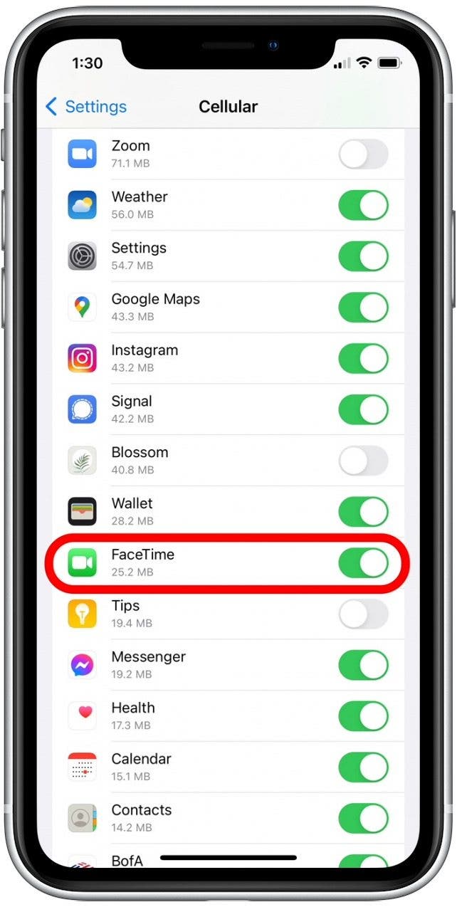 现在您已检查并确保已启用 FaceTime,您还需要确保已允许 FaceTime 使用蜂窝数据,而不仅仅是 Wi-Fi。一旦您允许 FaceTime 使用蜂窝网络数据,只要您有蜂窝网络或 Wi-Fi 连接,您就可以使用 Apple Watch Walkie-Talkie 与任何人联系。如果您选择不启用此设置,请注意您需要连接到 Wi-Fi 才能使用 Walkie-Talkie 应用程序。