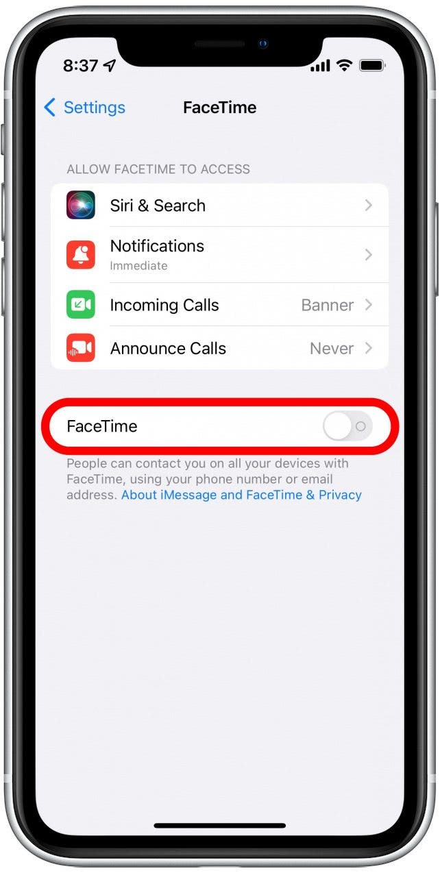 - 如果 FaceTime 已关闭,请点按FaceTime 切换将其打开。 (启用后该开关呈绿色。)