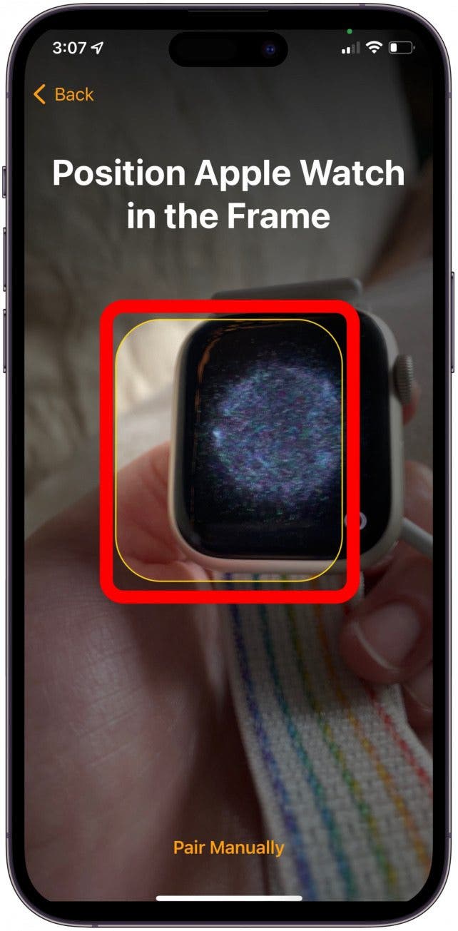 - 将您的 Apple Watch 放置在手机屏幕上的黄色框中。或者,您也可以选择手动配对。