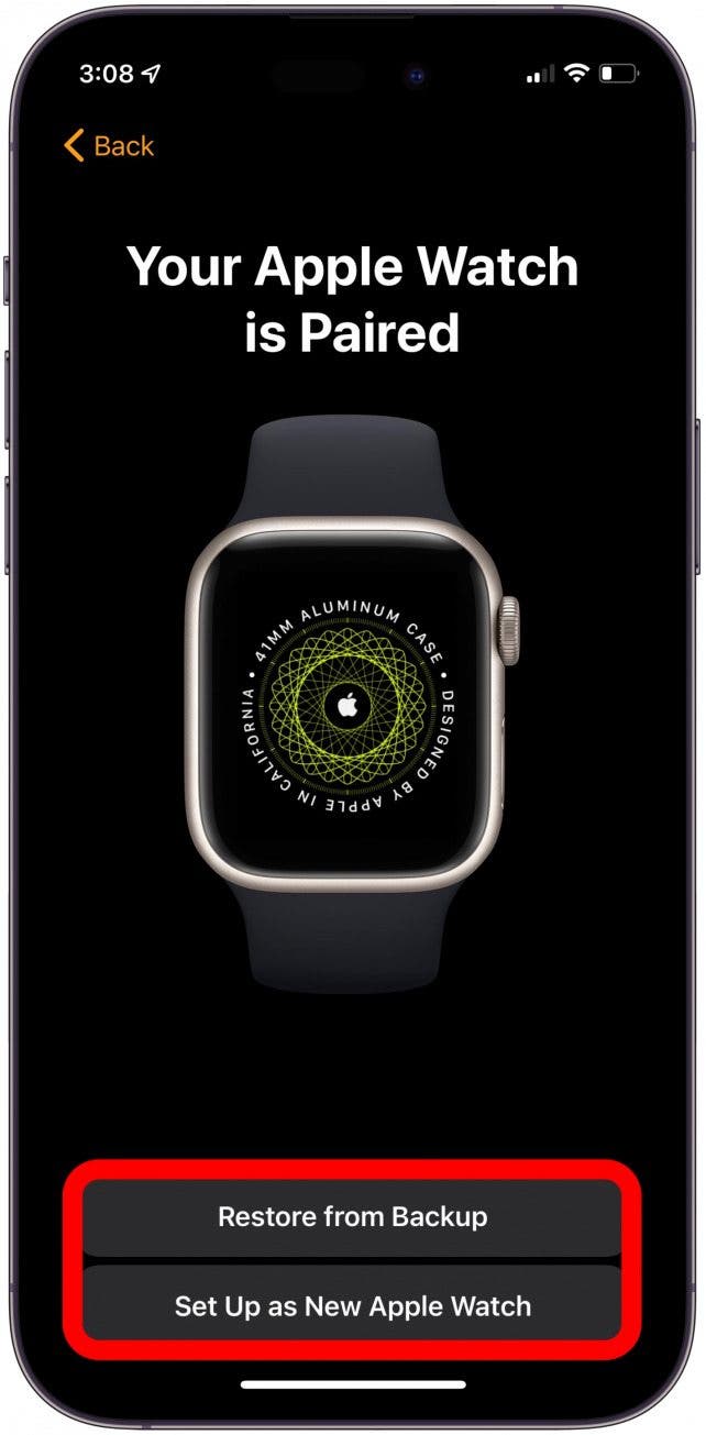 - 现在您的设备已配对,您可以通过点击从另一个手表备份中恢复它从备份恢复,或通过点击重新开始设置为新 Apple Watch。