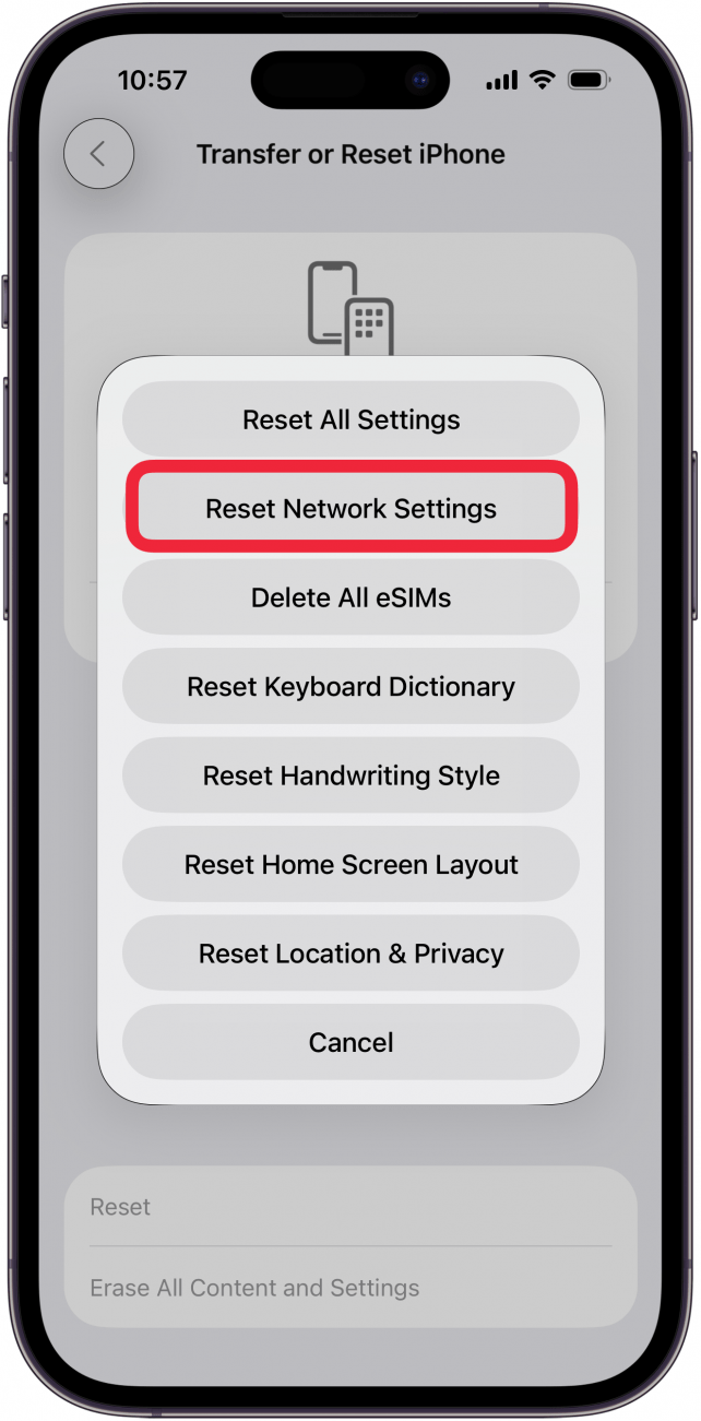 - 轻敲重置网络设置。您需要输入密码以确认您要重置。