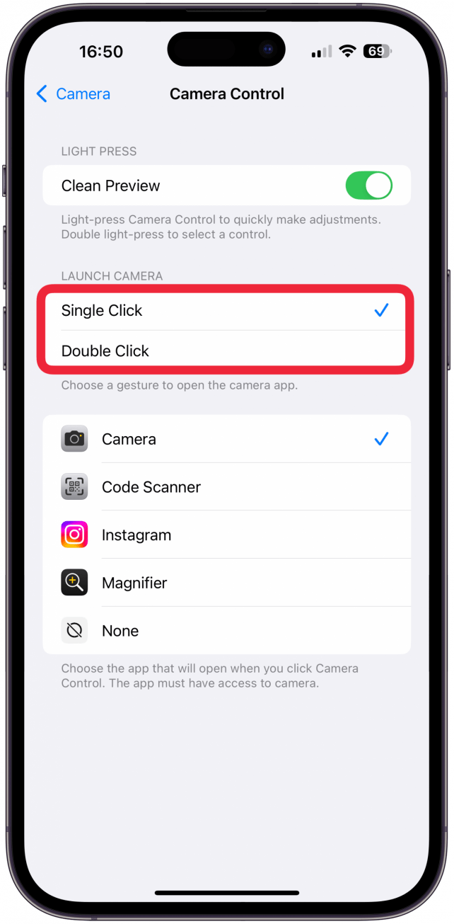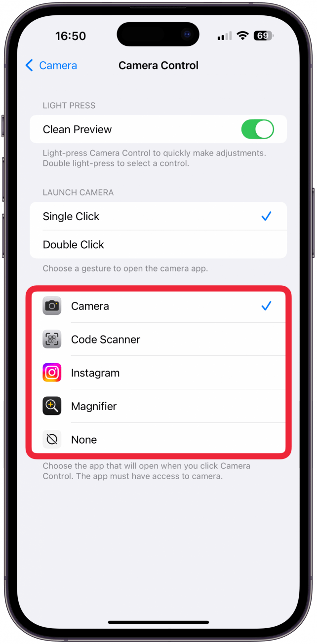 - 最后,您可以选择按下相机控制按钮时打开哪个应用程序。默认情况下,相机应用程序已选中,但您也可以选择 QR 码扫描仪、放大镜或无。根据您拥有的第三方应用程序,您可能会在此处看到第三方应用程序,例如 Instagram。