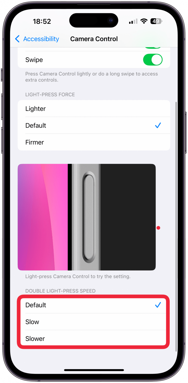 - 在下面双倍轻压速度,在“默认”、“慢速”和“较慢”之间进行选择。默认设置对我来说效果很好,但同样,您可能更愿意更改这些设置以找到最适合您的设置。