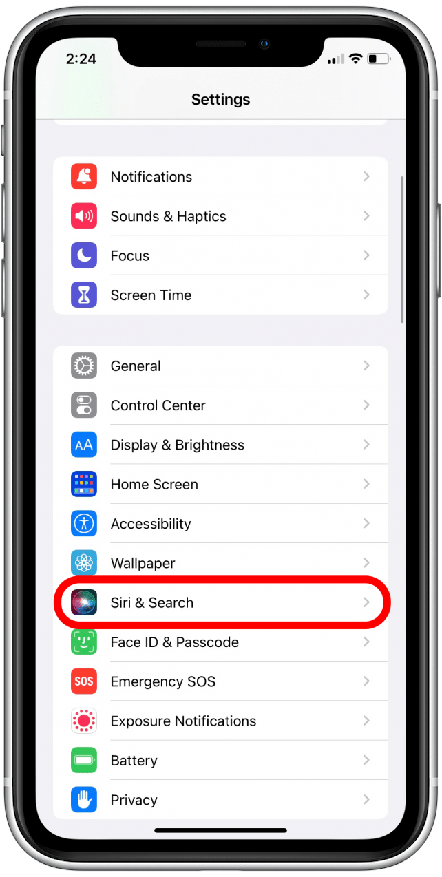 - 打开“设置”应用程序并点击Siri 和搜索.