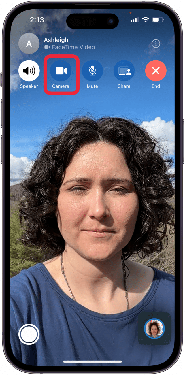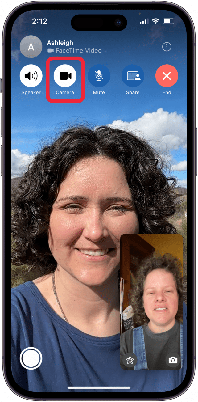 - 在 FaceTime 通话时点击屏幕以显示菜单选项,并确保相机图标具有如下所示的白色背景,表明相机已打开。