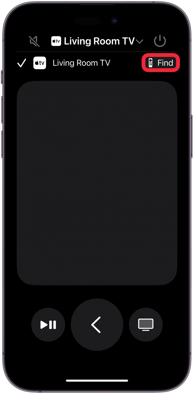 - 打开 iPhone 上的控制中心,点击 Apple TV 图标,选择您的电视,然后点击“查找遥控器”图标。