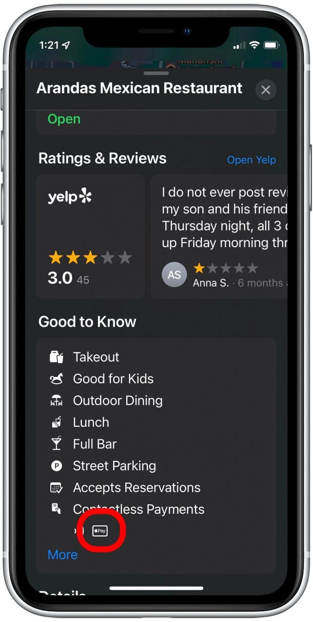 查找步骤很简单,但您必须逐一检查地点,以验证 Apple Pay 是否被列为每家企业接受的付款方式。如需更多方便的 iPhone 提示和技巧,请注册通讯。以下介绍了如何在 iPhone 上的地图中查找支持 Apple Pay 的商店。