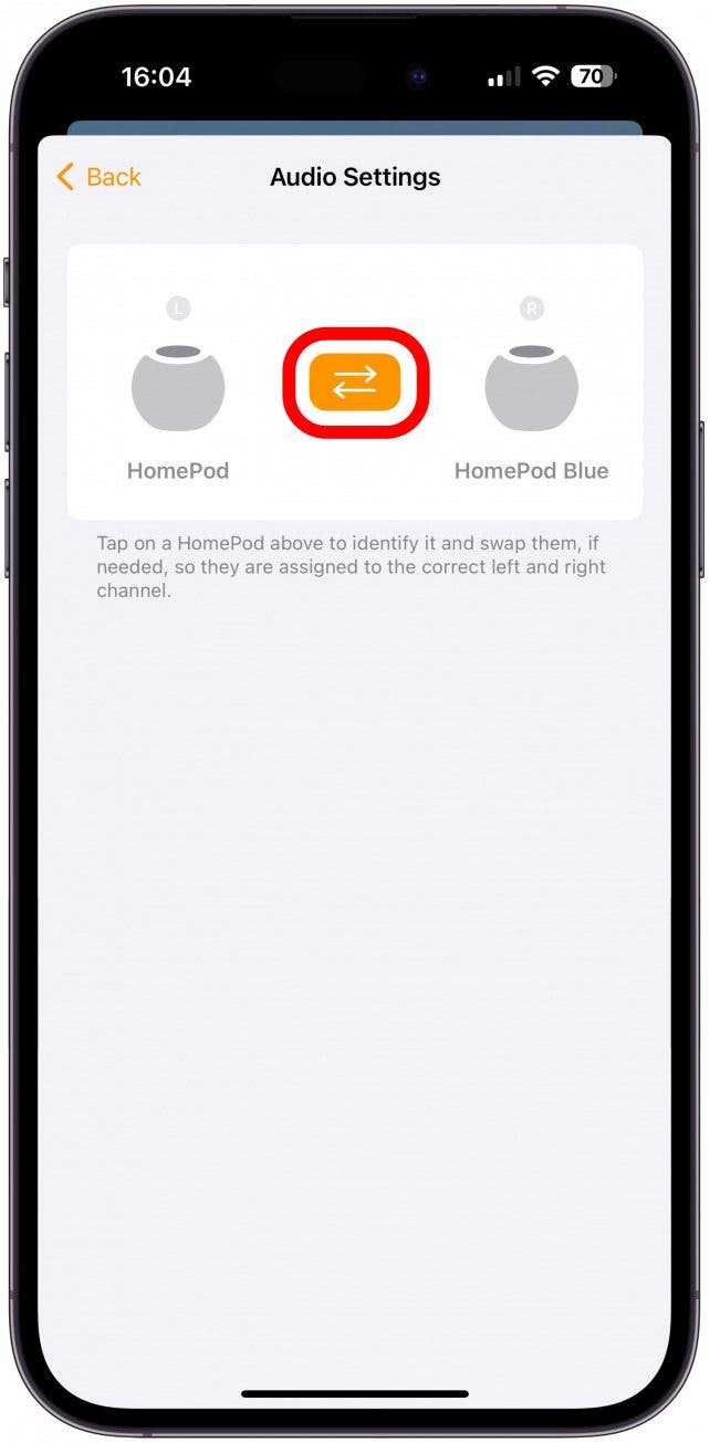 - 按照屏幕上的说明识别左右扬声器,然后点击中心箭头图标如果您需要从左到右切换 HomePod 频道。