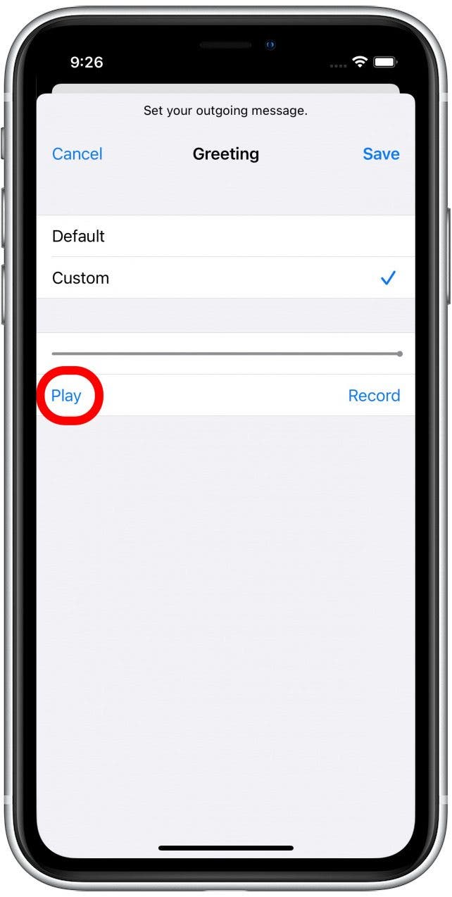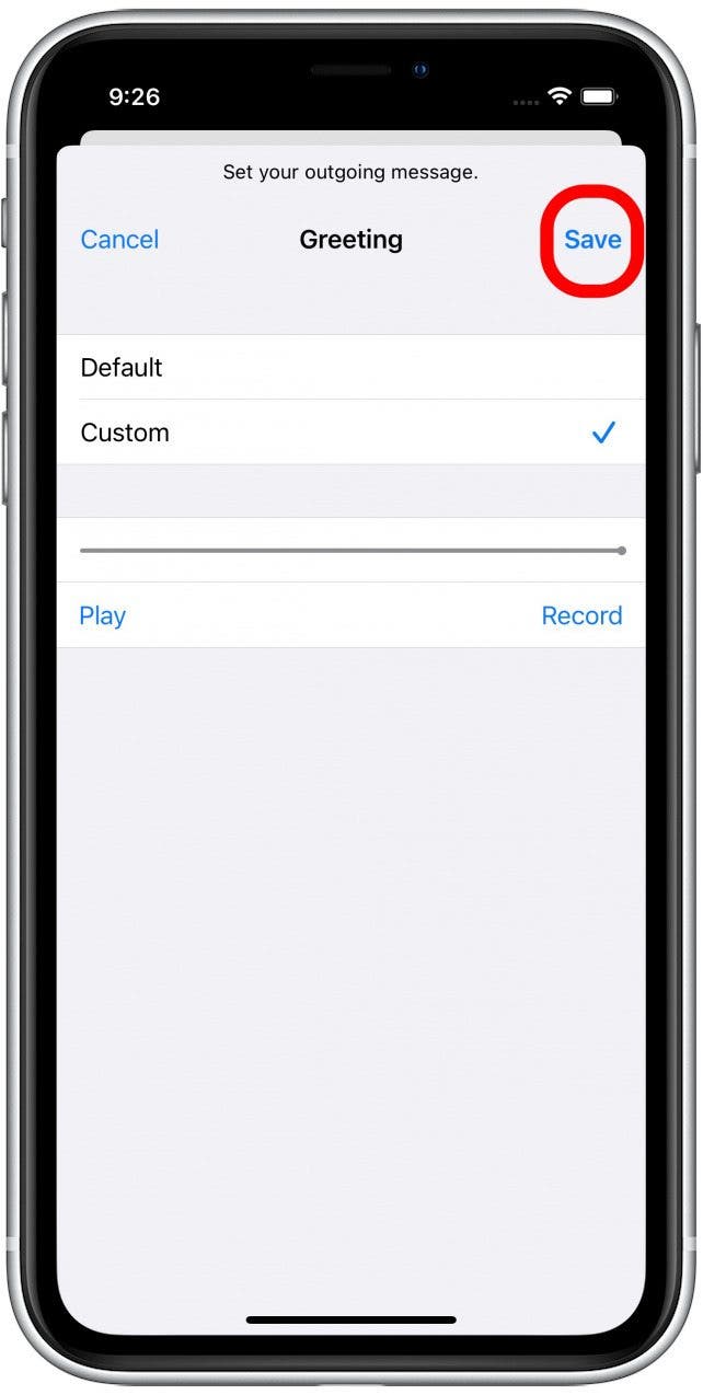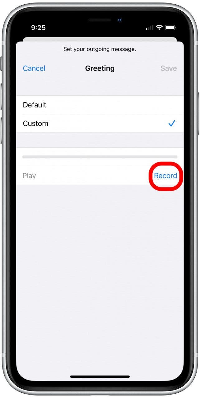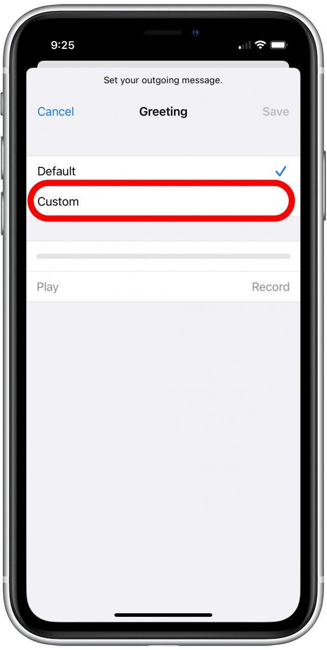 - 默认情况下,您的语音信箱将使用运营商的通用问候语进行设置。要录制自定义问候语,请选择风俗。