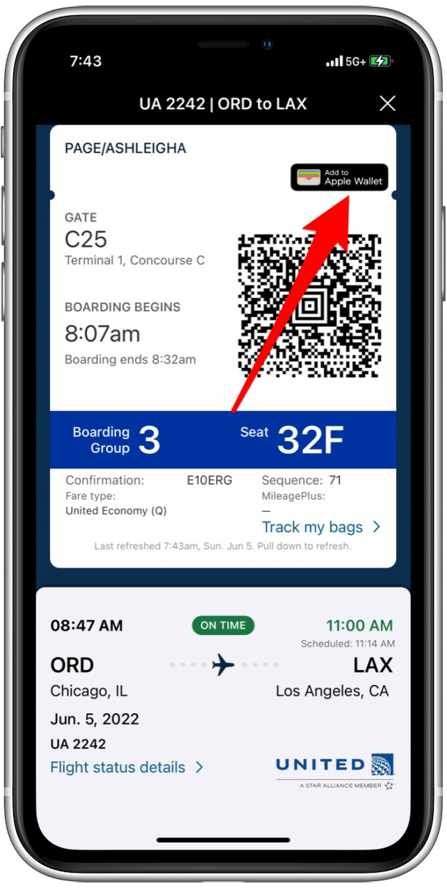 如果您已在线办理登机手续,请务必点击告诉航空公司通过电子邮件将登机牌发送给您的框。如果您使用的是 Apple 电子邮件地址,则您的登机牌应该已通过您的 iPhone 添加到 Apple 钱包中。如果您使用其他电子邮件地址,请按照以下步骤操作: