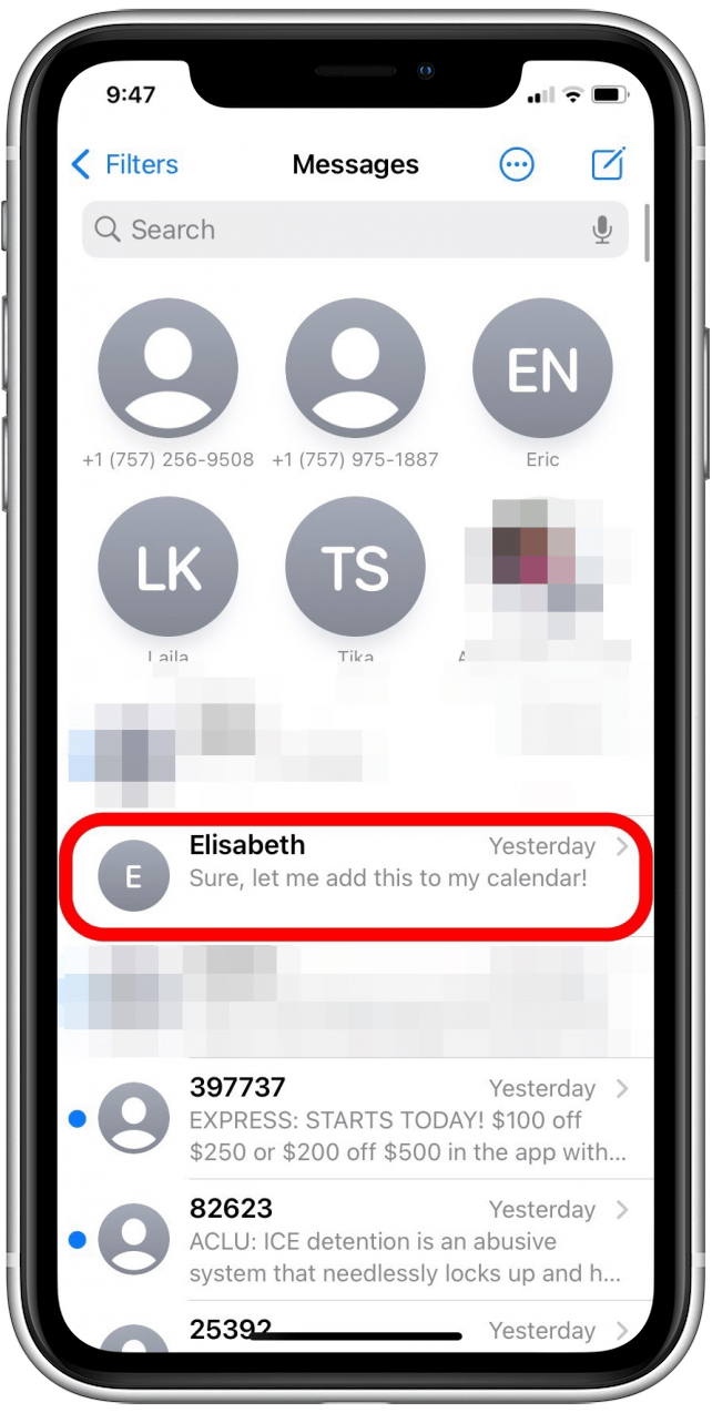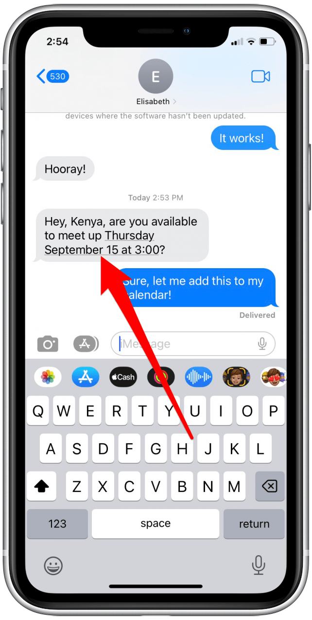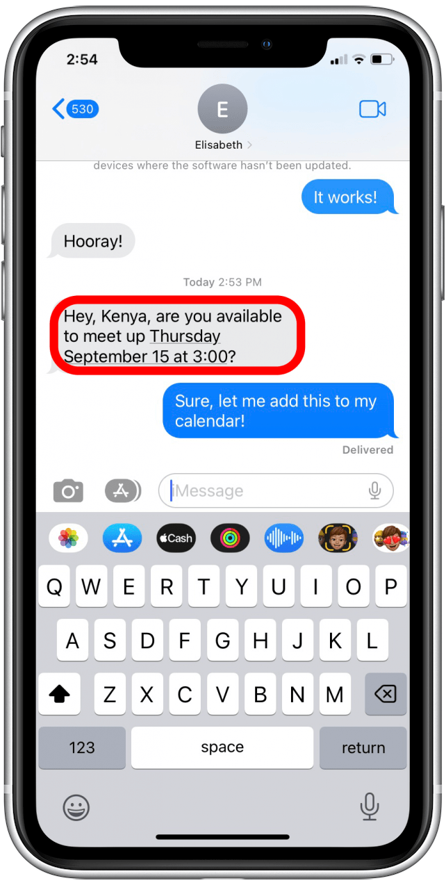 您不仅可以将其用于午餐约会。您收到的任何包含活动信息的文本都将带有下划线并且可以单击。然后只需点击文本并将其添加到您的日历应用程序即可。为此: