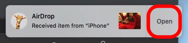 - 您会听到一声 ping 声,并在 Mac 屏幕上看到一条通知;点击打开查看您刚刚通过 AirDropped 发送的文件。