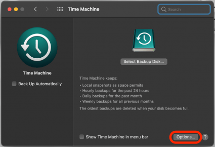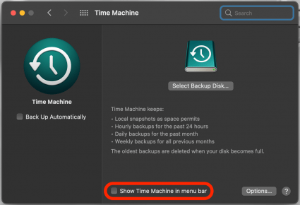 - 当您在“时间机器”偏好设置菜单中时,您可以选中或取消选中旁边的框在菜单栏中显示时间机器根据您的喜好。