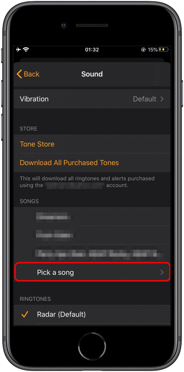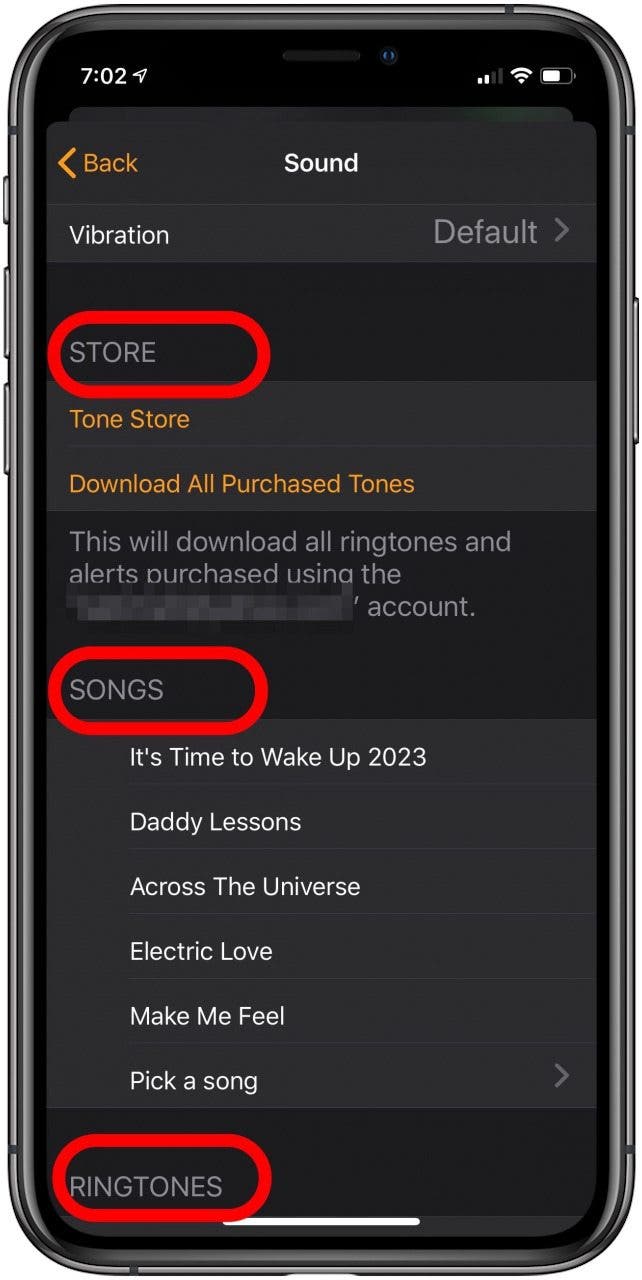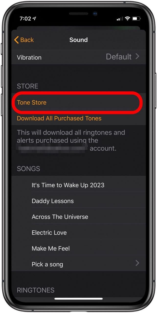 - 在这里,您可以通过三种不同的选项来更改 iPhone 上的闹钟声音:选择新的 iPhone 闹钟铃声、音乐库中的歌曲,或从 iTunes Tone Store 购买新的闹钟声音。向下滚动以获取有关如何选择其中每一个的说明。
