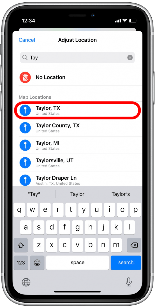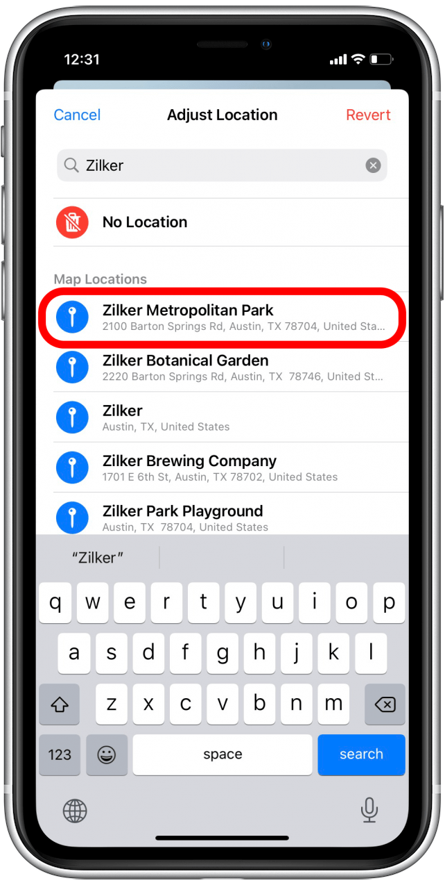 - 搜索并选择您想要分配给照片的新位置。您也可以选择“无位置”。