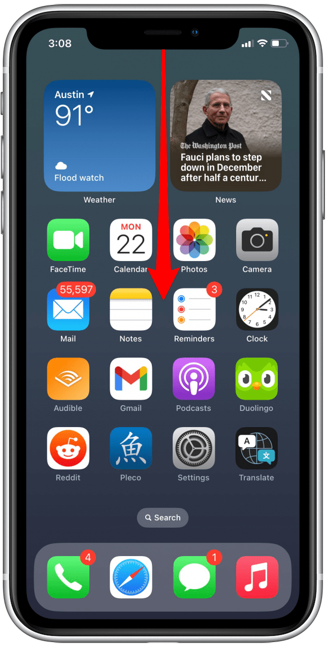 - 屏幕解锁后,从主屏幕中央顶部向下滑动以打开锁定屏幕。