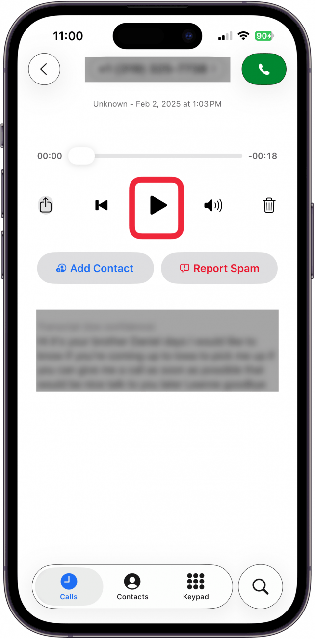 - 使用 iOS 26,您需要点击播放图标播放留言。在 iOS 18 及更早版本中,点击语音邮件也会在一两秒内开始播放,因此如果您不想听到该人的声音,请点击暂停图标。