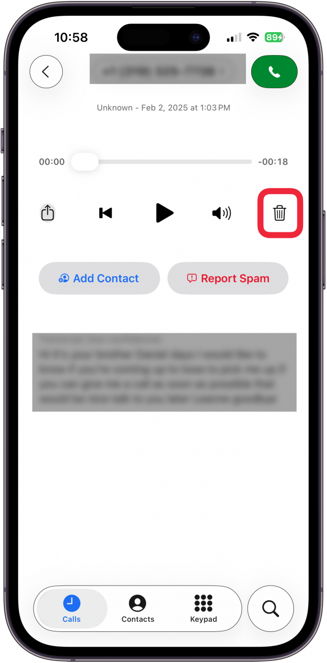 - 如果需要,请收听消息,或点击垃圾桶图标使用 iOS 26 或更高版本进行删除,或向左滑动并点按删除使用 iOS 18 及更早版本删除消息。