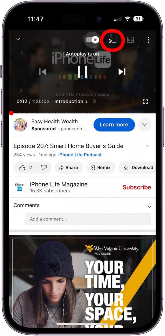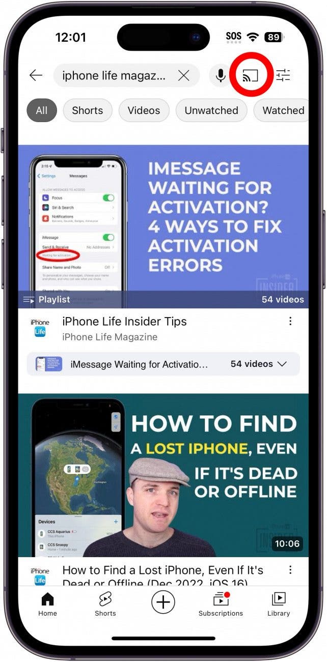 - 您也可以点击您要观看的视频,然后点击演员图标投射视频。在大多数应用程序中,如果您没有看到该图标,可以点击视频以使其显示。