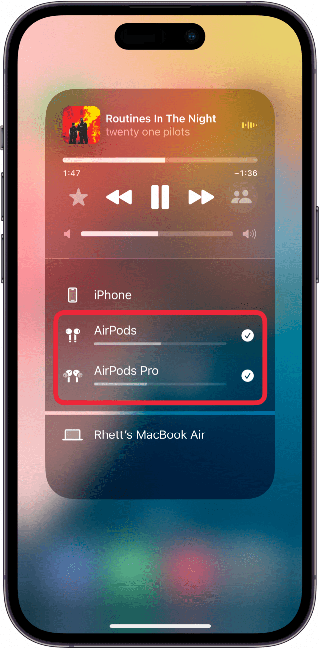 - 将第二对 AirPods 连接到您的 iPhone 后,您可以同时向两组 AirPods 共享音频。播放音频时,您可以拖动每对 AirPods 下方的滑块来调节音量。