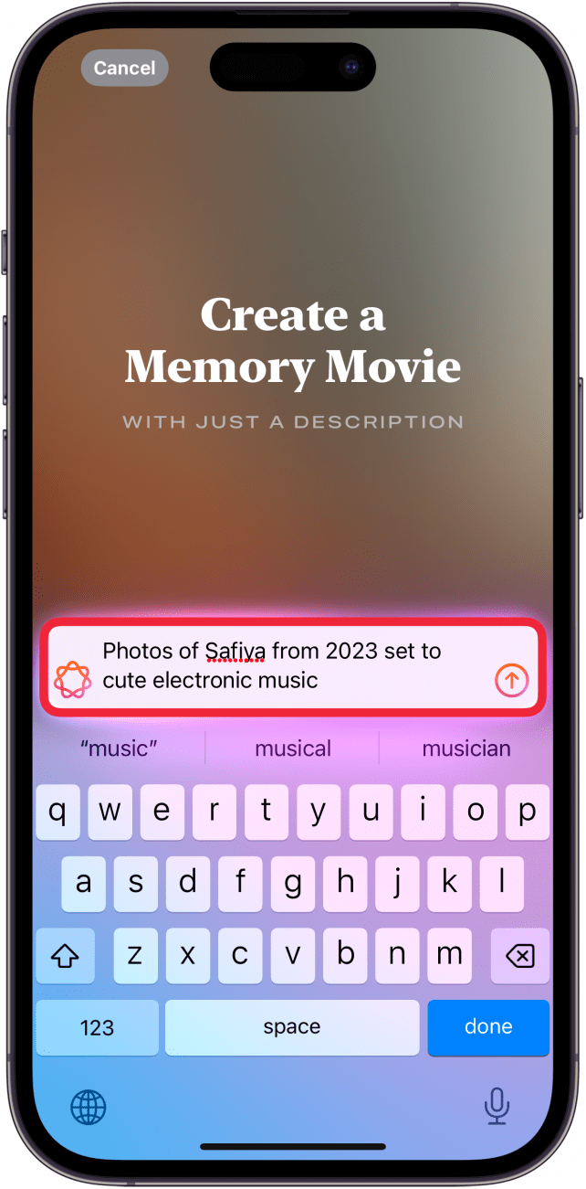 - 输入您想在内存中看到的内容,然后点击箭头。在此示例中,我要求 Apple Intelligence 使用去年的照片创建我的猫的幻灯片。
