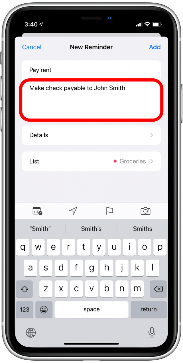 - 为您的提醒添加一个标题,告诉您要记住的内容,例如“支付租金”。