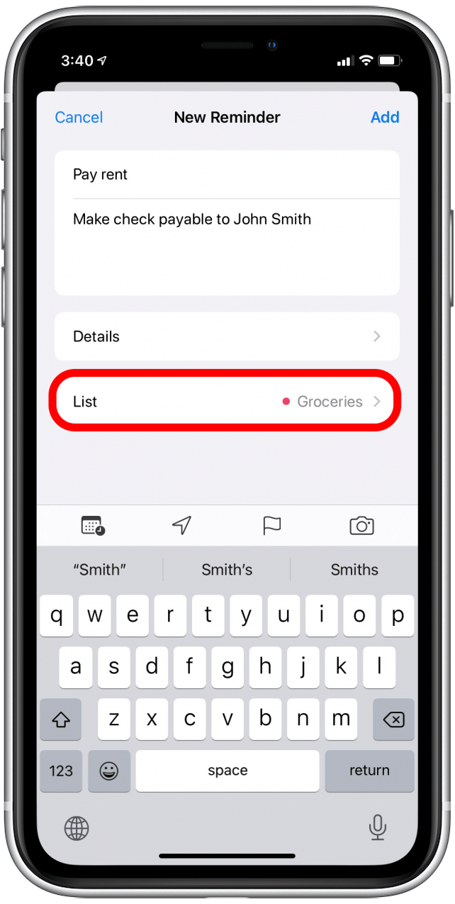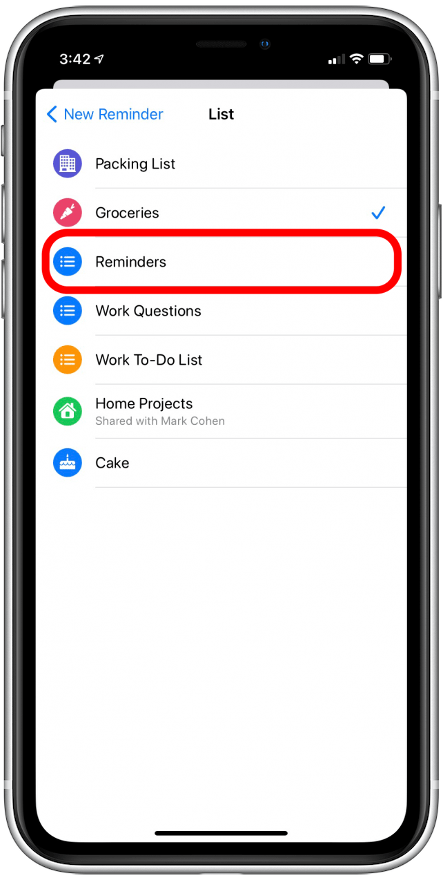 - 选择您想要将其添加到的列表,您将自动返回到“新提醒”屏幕以继续进行提醒设置。