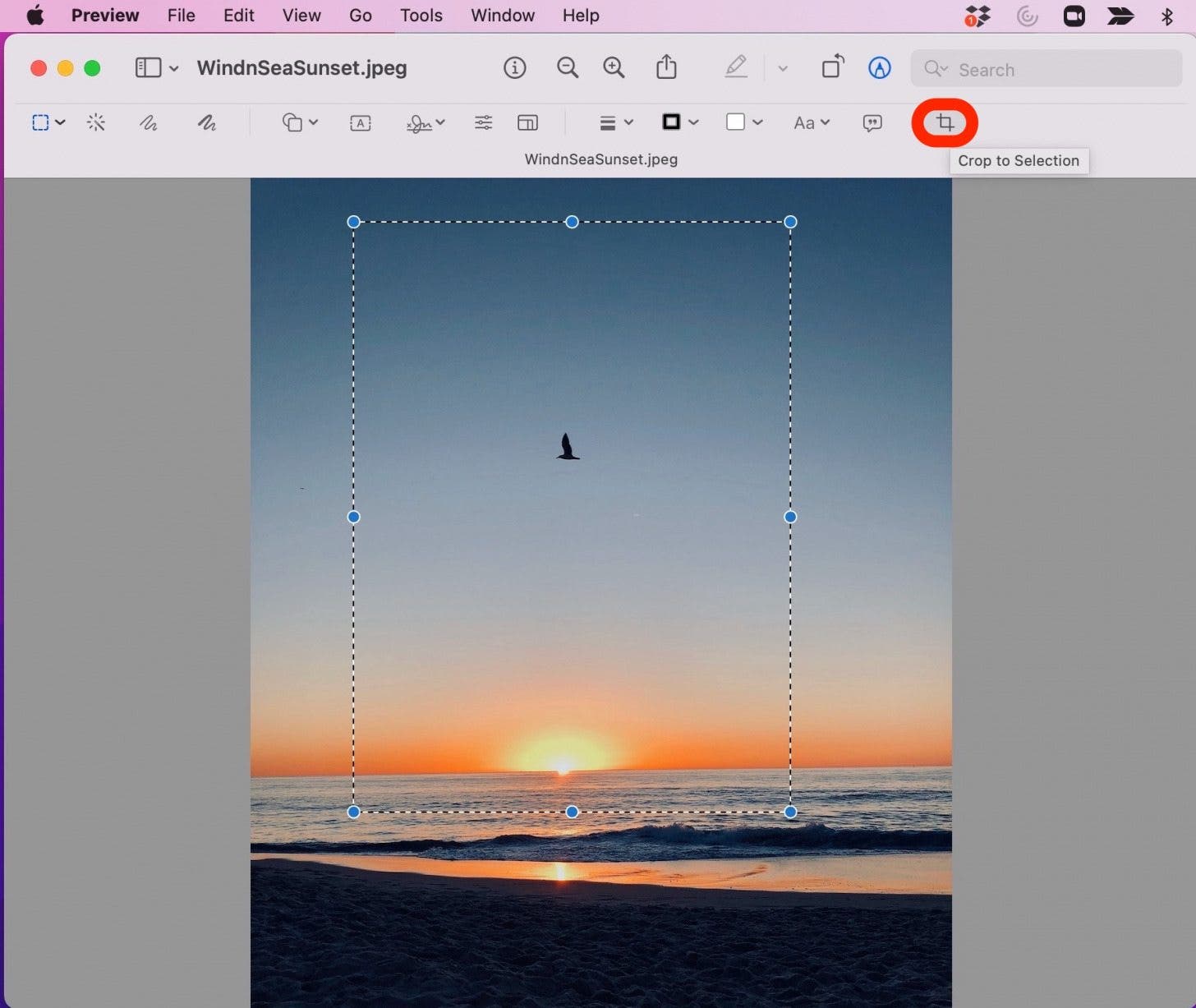 - 单击并拖动鼠标到要保留的图像区域。八个可扩展的蓝点将出现在您选择的区域上,并且边界外部的所有内容都将被裁剪掉。