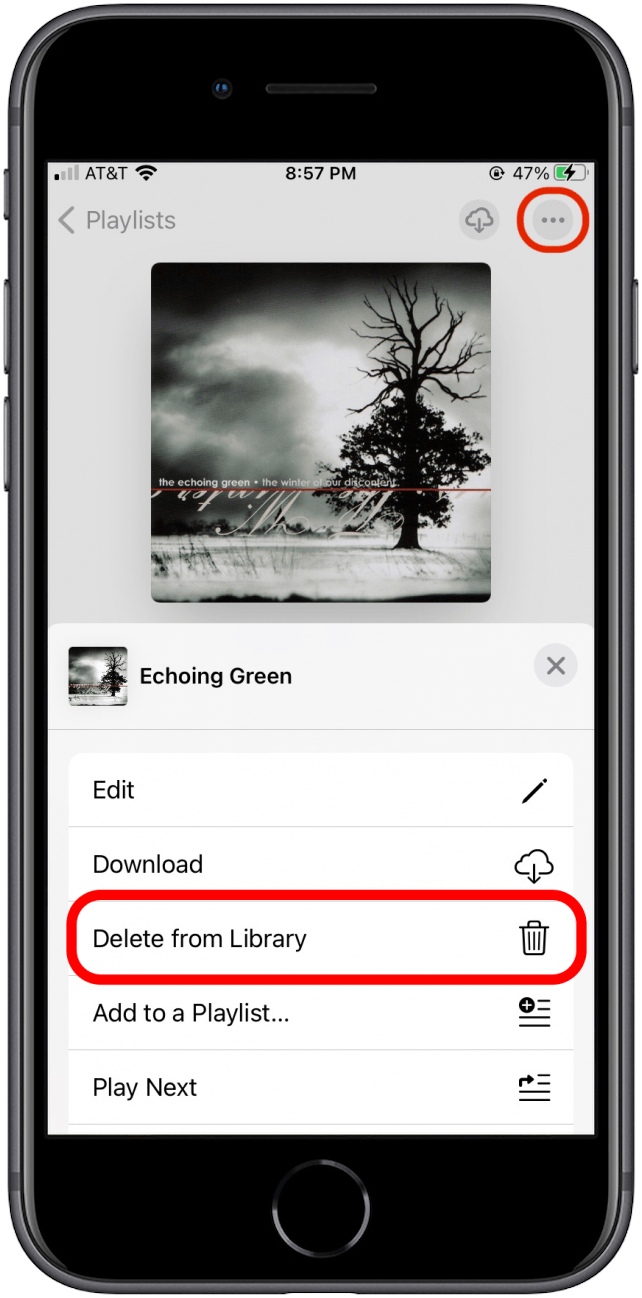 要编辑播放列表,请点击屏幕顶部的三个点。从弹出菜单中选择从库中删除。