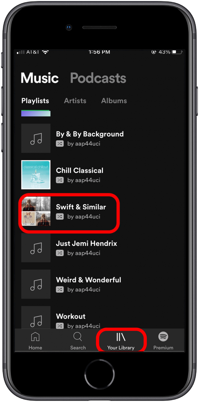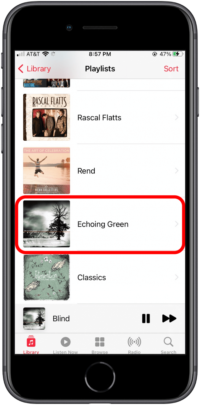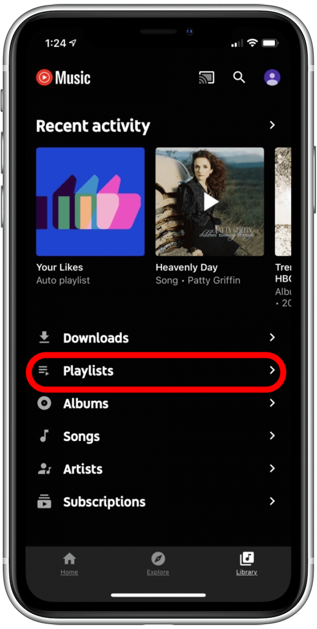 选择图书馆屏幕底部的选项卡,然后点击播放列表在顶部。