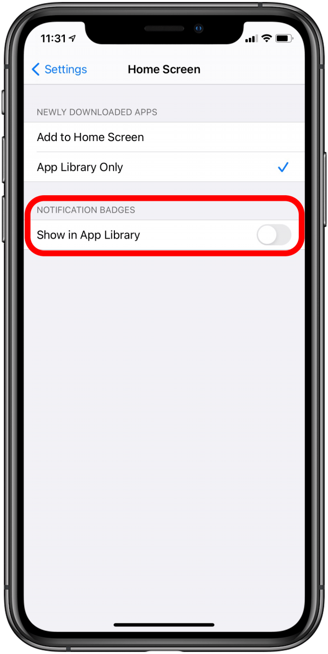 - 在“通知徽章”下,切换在应用程序库中显示在。该栏将为绿色,滑块将位于右侧,如下第二张图所示。