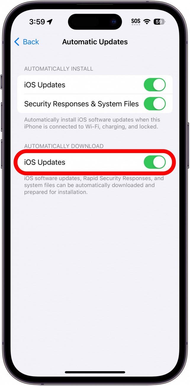- 在下面自动下载,您可以打开或关闭iOS 更新。开启后,将自动下载最新更新。如果您打开了此开关,但没有打开上一步中的开关,您的 iPhone 将下载更新但不会安装它们。