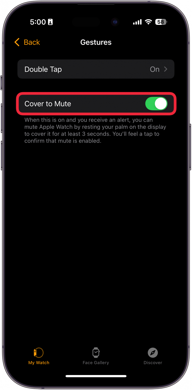 这就是如何通过启用“封面静音”来静音 Apple Watch 上的通知。按照切换状态下的说明,您可以通过用手掌覆盖脸部三秒钟来将 Apple Watch 上的警报静音。您的手表将通过轻微振动确认静音操作。启用“封面静音”功能后,您无需按 Apple Watch 上的任何按钮即可快速静音警报!接下来,了解一下。
