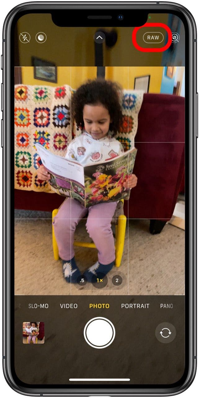 - 要拍摄 Apple ProRaw 照片,请打开相机应用程序,点击原始图标并确保没有斜线穿过它,然后照常拍照。