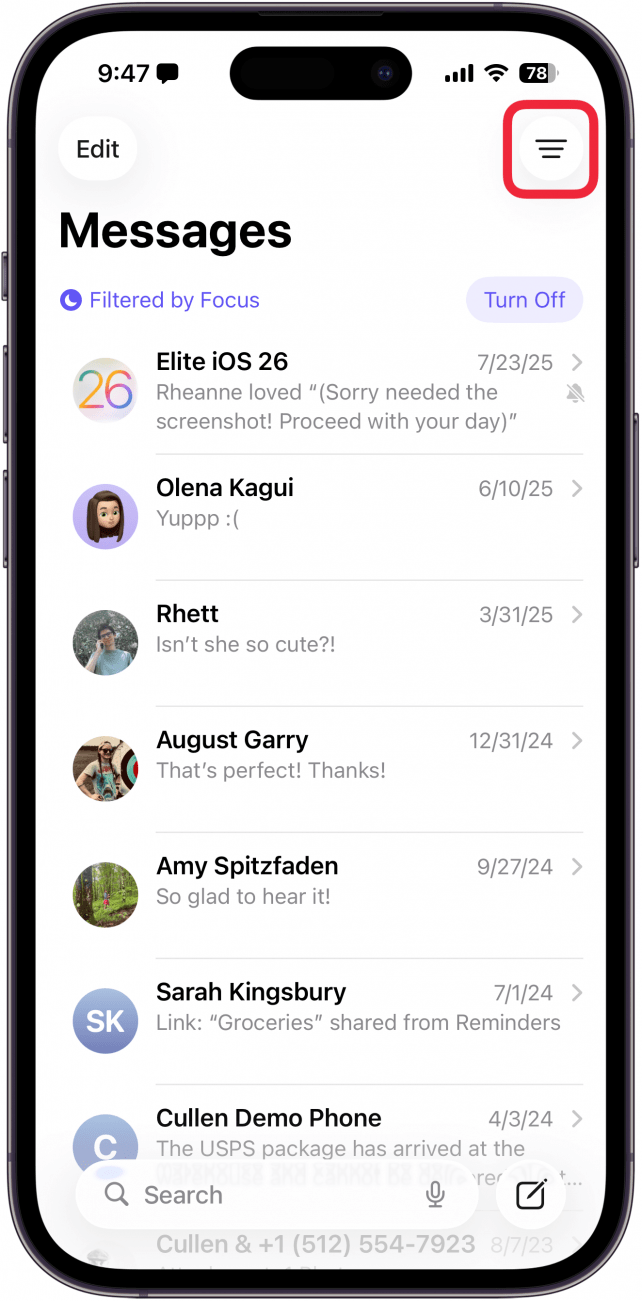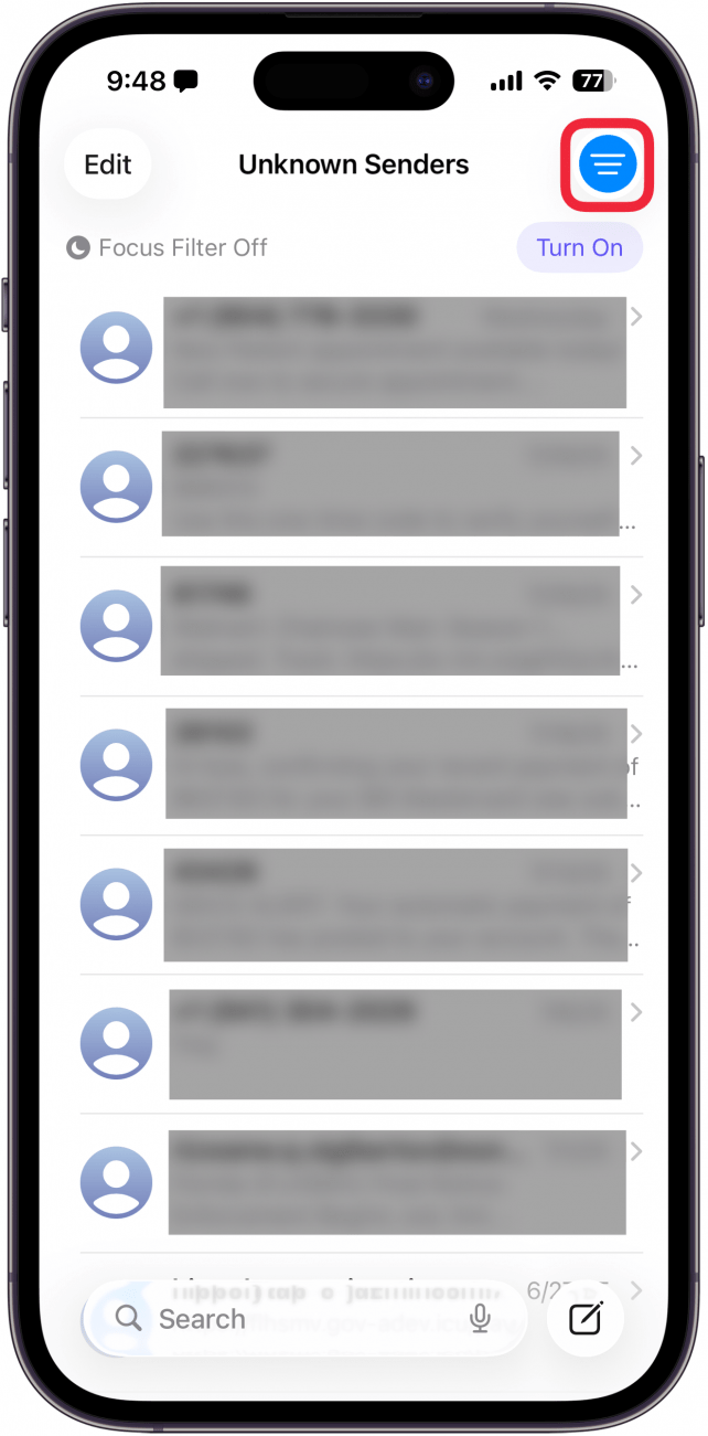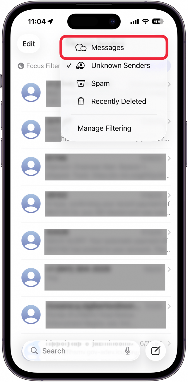 - 现在,如果您想查看来自未知号码的短信,请返回“消息”应用程序,然后点击过滤器图标再次。